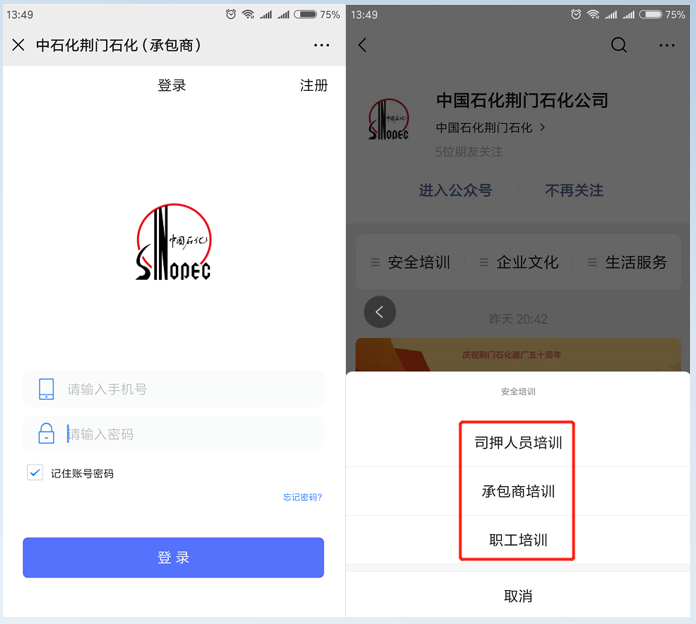 描述信息:荆门石化微信公众号承包商、职工人员在线考核系统上线
